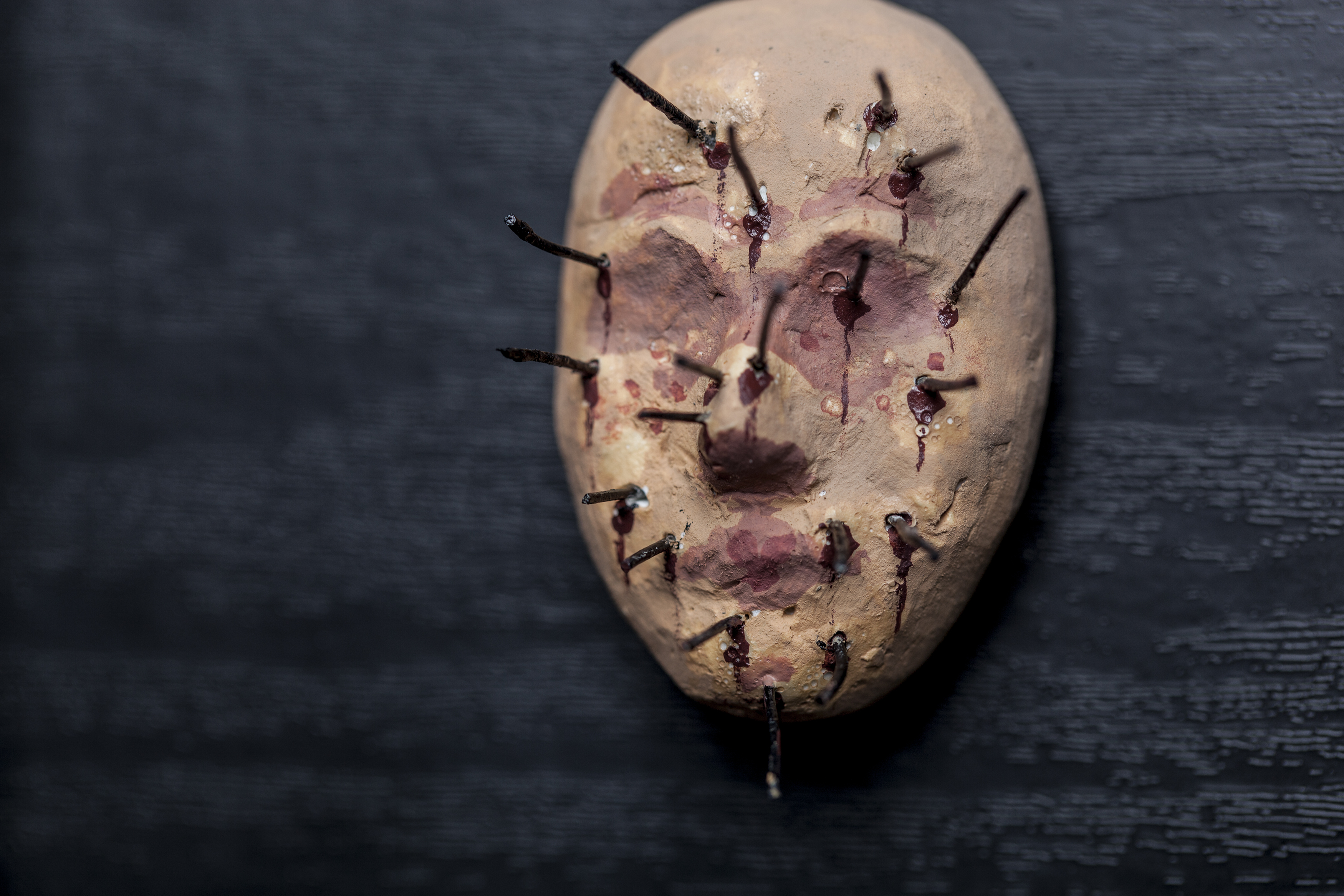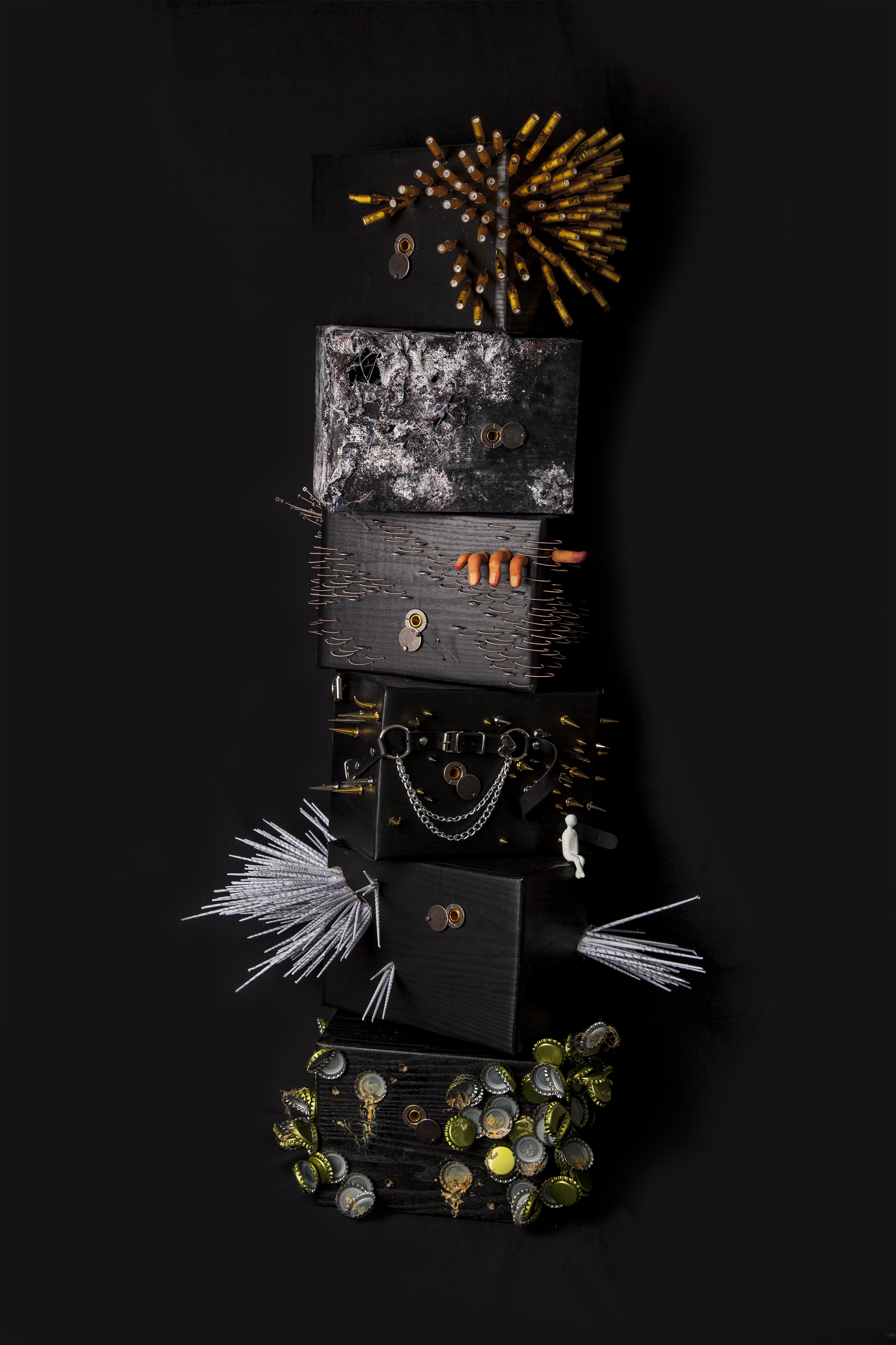 Materials: Carton, plaster, clay, cat’s eyes, paper, rivet, string, tattoo needle, bottle lid, 3-D printing materials, etc.